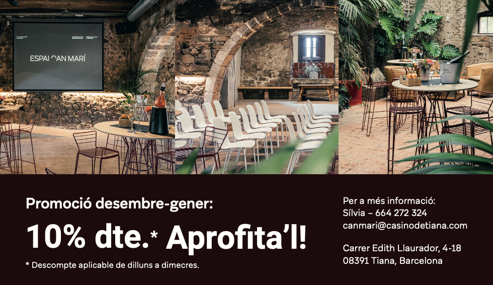 L’Espai Can Marí és una masia restaurada i integrada dins el recinte del Casino de Tiana. Envoltat de jardins i amb vistes a la Serralada de Marina i al mar, L’Espai Can Marí és un espai privilegiat i únic per a la celebració d’esdeveniments d’empresa. Oferim diferents espais adaptables a les necessitats de cada esdeveniment.